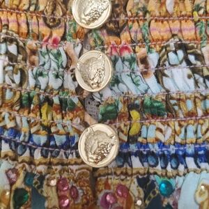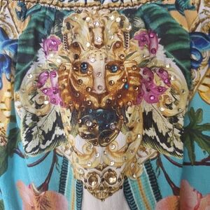 Vibrant off-the-shoulder silk mini dress with floral and animal print by Camilla. Features colorful embellishments and a smocked waist,long sleeves and side pockets