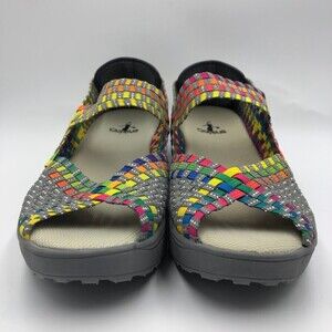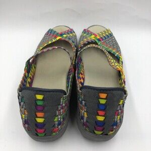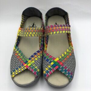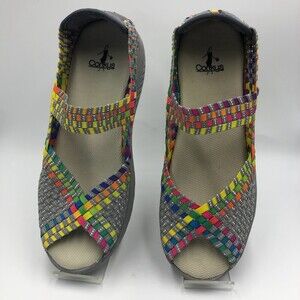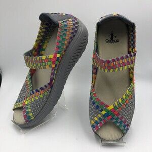 Corkus Women's Colorful Wedge Sandals Mary Janes Slip On Open Toe Beth Size 10. Shoes are pre-owned. Please see all photos for visible condition. No original box. Based on the condition of the soles these don't look worn - sticker still on bottom. Multicolored - gray/silver/yellow/green/purple/orange/blue/pink. 2 in wedge heel. Lightweight.