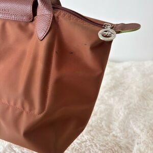 Stylish Longchamp tote in rich brown with medium use, perfect for every day. Small stains shown in photos