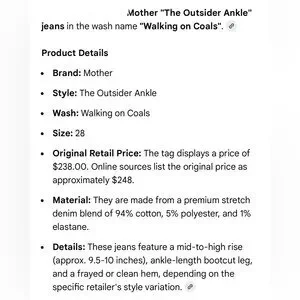 “The outsider ankle” style MOTHER brand, size 28 mid to high-rise waist, new with tags, never worn or laundered. Excellent new condition, retail $238 at Nordstrom.