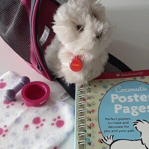 American Girl Coconut Dog Carry Case and Accessories + Bonus Book - very good used condition *except carry bag is peeling on the bottom, shown in last pic. - box included