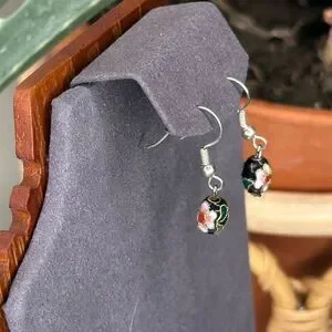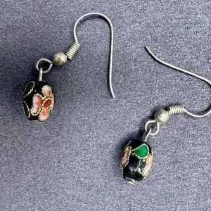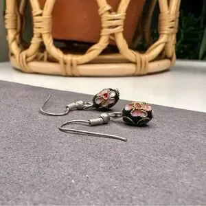 Vintage Cloisonné Enamel Bead Earrings Black Floral Drop Dangles Hand-Painted