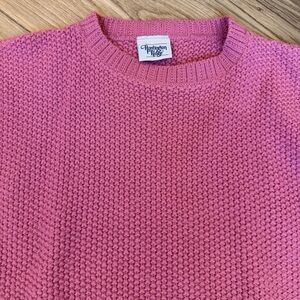 Beautiful Huntington Ridge crewneck sweater in a soft dusty rose pink. Features a chunky textured knit with ribbed neckline, cuffs, and hem. Classic relaxed fit – perfect for fall and winter layering. Great quality, cozy weight, and timeless style. Vintage!