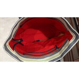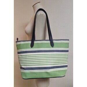The Dooney & Bourke Westerly Collection Large Canvas Coated Tote Bag is a stylish and versatile accessory for women. This rectangular tote features a zip closure, blue leather double handles, and silver hardware accents. The bag is lined with cotton and includes inner pockets, a mobile phone pocket, and a keys holder. The exterior is coated canvas in shades of green, blue, and white, with a striped pattern and a water-resistant finish. Perfect for various occasions such as travel, workwear, or casual outings, this tote is both practical and fashionable.