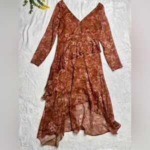 Marchesa Notte Floral Chiffon Asymmetrical Ruffle Dress in Rust Womens 8