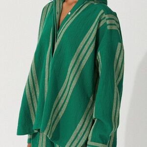 Effortless and chic oversized button-up shirt by Zulu & Zephyr. Features a vibrant green base with natural cream stripes, woven texture, and relaxed fit. Perfect as a layering piece, beach cover-up, or styled with denim for a casual look. Great transitional look.