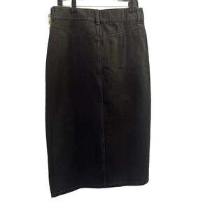 This high-quality denim skirt features a faded black wash for a vintage-inspired look. It is designed with a high-rise waist, double button closure, and utility-style front patch pockets. The dramatic front slit adds movement and a modern touch to the classic midi length.