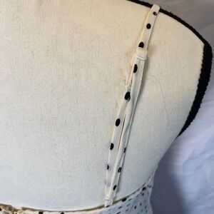 Keywords: polka dot, mini dress, spaghetti strap, ruffle hem, cream, black, summer dress, casual dress, sweetheart neckline, aline dress, vintage inspired, day dress