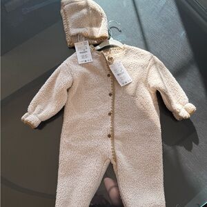 Adorable cream sherpa baby outfit with a matching bonnet. Perfect for keeping your little one warm and stylish.