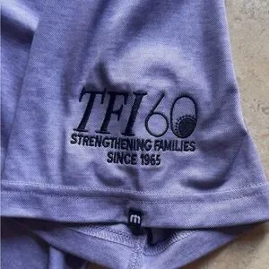 The promotional label on the left sleeve reads "TFI 60 Strengthening families since 1965" and refers to TFI (Texas Family Initiative) which operates in Dallas and is focused on child welfare services including foster care, adoption, family reunification, and prevention support.