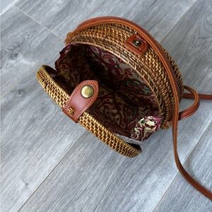 Stylish round woven crossbody bag in a rich brown color. Perfect for casual outings and adding a touch of elegance to your look.