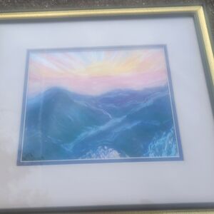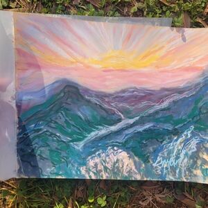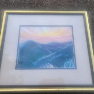 Experience the serene beauty of a sunset over mountains with this stunning ORIGINAL FRAMED ARTWORK. The vibrant blend of pink, purple, and green hues creates a captivating scene. Perfect for adding a touch of nature to your home decor.