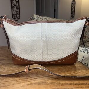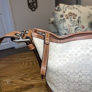 The Coach White Sand Mn Signature E/W Sft Duffle 10945 is a stylish and versatile handbag for women. Featuring the signature logo pattern and a zipper closure, this medium-sized bag is crafted from luxurious leather with silver hardware accents. The interior is lined with fabric and includes a leather handle/strap for easy carrying. The crisp white exterior color adds a touch of sophistication to any outfit, making it a must-have accessory for the fashion-conscious woman. There is one slight scuff on the bottom, but otherwise it is in perfect condition. Please see photo.