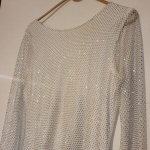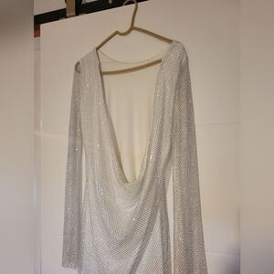 Stunning backless dress. Features shimmering mesh overlay. Perfect for evening wear.