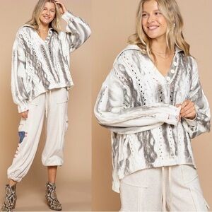 Thick Chunky Big neck sweater Features a stylish cable knit design. Soft white/offwhite/cream & gray tones or An intended tie-dye of Ombré grays with white hues.