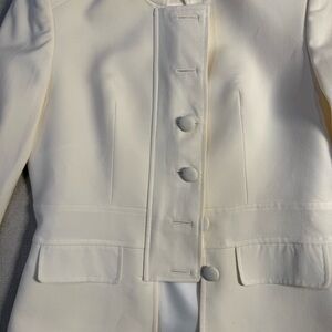 Elegant ivory suit jacket with structured design. Features a high neckline and button accents. Ideal for sophisticated events.