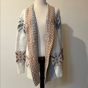 Embrace warmth and style with this cozy cardigan. Featuring a charming white, gray and brown pattern, it's perfect for layering on cool days. Women’s size S. Good preowned condition