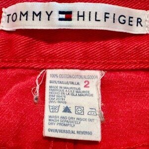 This is a vintage Tommy Hilfiger Y2K red denim mini skirt in women's size 2. The skirt features a solid pattern, zip closure, mid-rise, and iconic accents like the logo on the backside & waist. Made of cotton denim fabric, this retro skirt has a classic and casual style with y2k and vintage vibes. It is machine washable and unlined, perfect for all seasons.