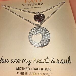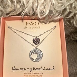 Elegant FAO Schwarz fine silver tone necklace set in gift box. Featuring heart designs. Perfect for mother and daughter or keep one give one gift set. Pendant-.75x.75 Necklace- 16in + 2in extender New in box