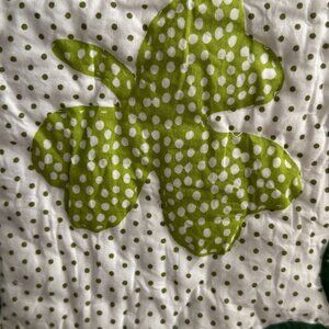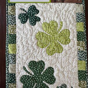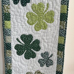 Elevate your St. Patrick’s Day decor with this quilted table runner. Featuring a charming green and white shamrock design, it complements festive tablescapes.