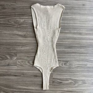 A sweater knit bodysuit for those days when you wanna take your outfit down a notch. It features a sleeveless crew neck with a front-notch accent, a form-hugging fit, and a thong bottom with dual snap-button closures. Complete the look in trendy dad jeans.