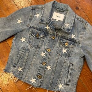 Chic blue denim jacket by Pistola. Features playful white star patterns. Ideal for casual outings.
