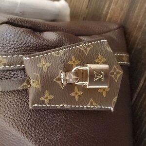 Sophisticated LV Express MM style shoulder bag in dark brown. Features elegant gold accents.