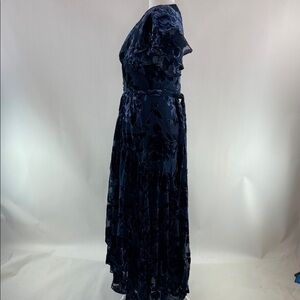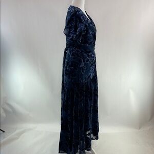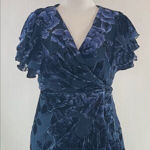 Blue floral velvet (80% Viscose, 20% Nylon). Wrap. Short sleeves. V-neck. 58" shoulder to hemline. Imported.