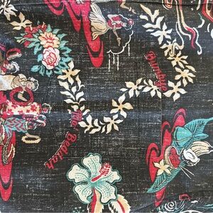 Classic Reyn Spooner shirt with floral patterns. Features red and white designs on a black base.
