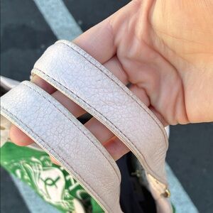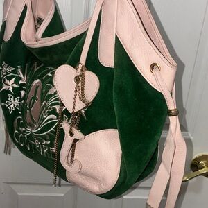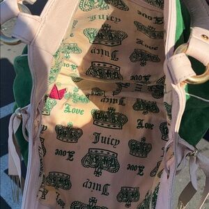 Elegant shoulder bag with rich green exterior and baby pink trimming. Embroidered lettering on front states “VINTAGE JUICY” on front. Interior is cream and Features iconic gothic signature Juicy logo with crown motif interior print.