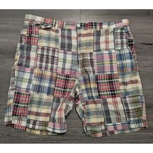 Polo Ralph Lauren Men's Madras Multicolor Patchwork Plaid Shorts Size 44x9. The inseam is measuring 42". Very Good Used Condition. Shipped via USPS Ground Advantage.