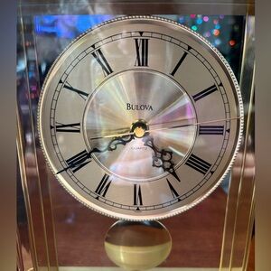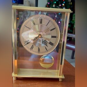 vintage Bulova B1704 T6 quartz mantel clock with a bright brass finish. Pre owned and in excellent condition.