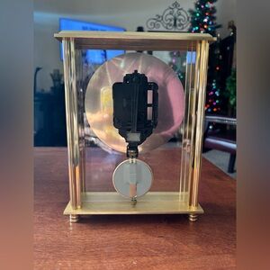 Bulova Quartz Mantel Clock, commonly associated with model number B1704. It features a bright brass finish, glass panels, a white dial with Roman numerals, and a visible revolving pendulum. The movement is battery-operated quartz, and the model is often described as an "anniversary style" or "desk/mantel" clock. AA battery not included.
