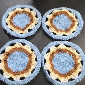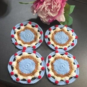 Set of four handmade crochet coasters. Features blue, brown, cream, and red colors. Perfect for adding a touch of charm to your table.