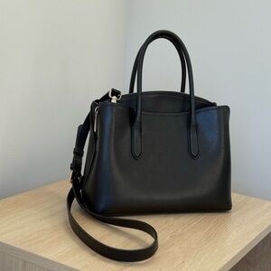 Chic black satchel by Kate Spade. Features a sleek design with dual handles and a crossbody strap. Gently used, still in good condition.