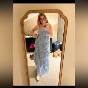 Step out in style with this elegant blue strapless lace dress. Perfect for any occasion, this dress offers a flattering fit and a touch of sophistication.
