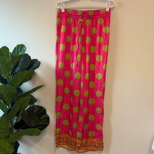 100% polyester silky feeling. Button up long sleeve top. And wide leg pants. These are a roomier fit, not slim fitting.