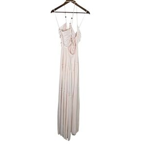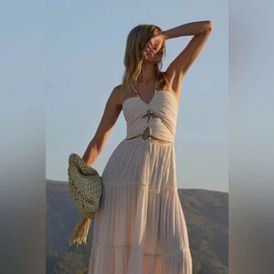 Elegant ivory dress with a backless style. Halter neckline and flowing skirt. Ideal for special events.