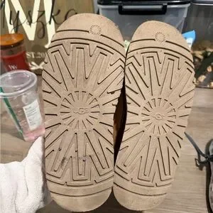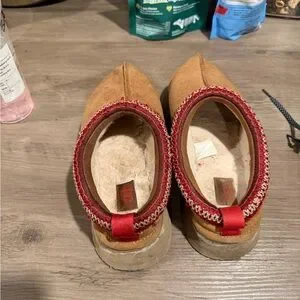 Comfortable UGG slippers in brown with red trim. Ideal for cozy wear. Minor wear, can easily be washed