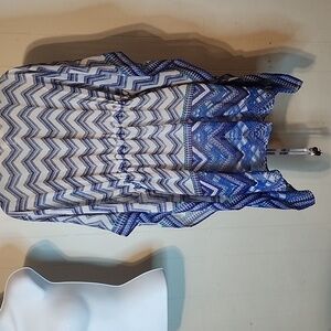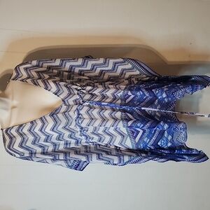 Embrace the beach vibe with Chico's chic swim coverup, featuring a captivating blue and white chevron pattern. This lightweight, flowing design with a V-neckline and kimono-style sleeves is perfect for poolside relaxation. The ombré effect adds a touch of elegance, transitioning from soft hues to a rich royal blue at the hem.