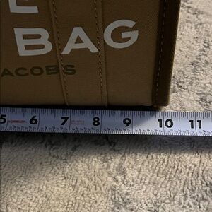 Compact Marc Jacobs tote with bold lettering. Tan exterior with vibrant yellow interior. Ideal for daily essentials. This bag still has the authentication tag from the retailer where I purchased it. The bag is a tan canvas with darker brown on the sides and a bright green accent color with the zipper. I just decided that the bag is a bit too small for me.