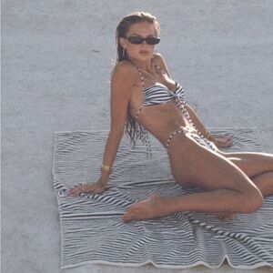 Stylish black and white striped bikini set. Perfect for beach days. Never worn. Please note top is XS and bottoms are size small. I don’t think it makes a difference. I would say both are XS/S