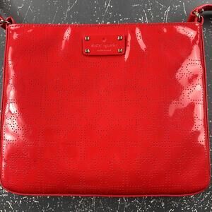 Kate Spade Darby Metro Slim Swing Crossbody Bag in a vibrant red vegan leather with perforated heart design.