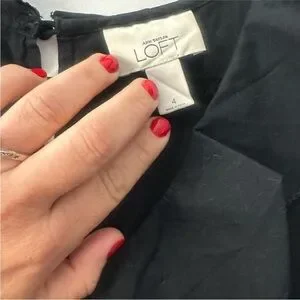 Elegant and timeless LOFT black sleeveless dress in size 4. Features a feminine ruffle neckline and stunning 3D floral appliqué along the hemline for a romantic, elevated touch. Fully lined in 100% cotton for comfort with delicate polyester floral detailing. Perfect for weddings, parties, date nights, or cocktail events. Excellent pre-owned condition with plenty of wear left.
