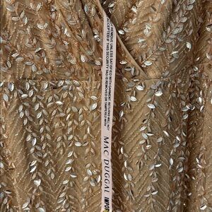 Crafted from beautifully embellished fabric, this gown is proof that details matter. Styled with a V-neckline, surplice bodice, fluttery sleeves, and a column skirt, this dress is a masterpiece. The allover beaded and sequined leaves and branches add a unique touch, perfect for any special occasion.