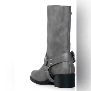 Je t’aime a staple bootie. The AZALEA WANG Mon Cherie Gray Bootie is crafted using a faux leather upper and features a subtle metallic sparkle throughout, a squared toe silhouette, a chunky stacked heel, a mid-calf shaft height, and faux silver metallic hardware. Complete with buckled accents, adjustable strappy belted detailing, and an easy pull-on fit.