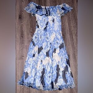 Chic off-shoulder maxi dress with blue floral design. Ideal for stylish outings.
