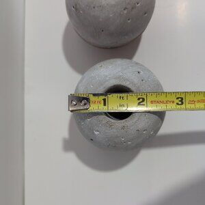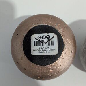 These CB2 spheres are elegant decorative balls made of cement, featuring a contemporary design in a stylish grey color and dipped in a copper tone paint. Originating from China, these spheres are perfect to add a touch of sophistication to any room in your home. Each sphere is dipped in copper paint, giving it a unique and eye-catching finish that is sure to enhance the decor of your space. Ideal for adult homeowners looking to add a modern and chic touch to their living environment.