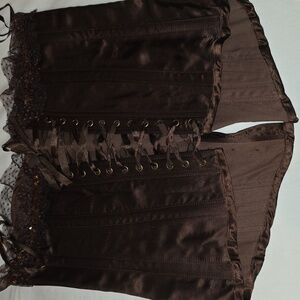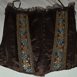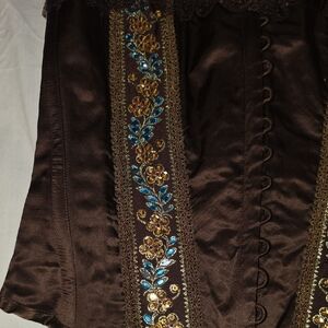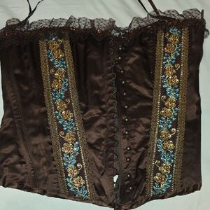 Stylish brown corset with blue and gold floral accents. Features lace-up back for adjustable fit. greatbfor all occasions very elegant corset. Vintage size small