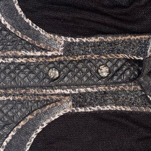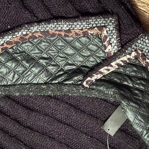 Stylish black cardigan with quilted gray accents. Features large buttons and front pockets. Perfect for layering.